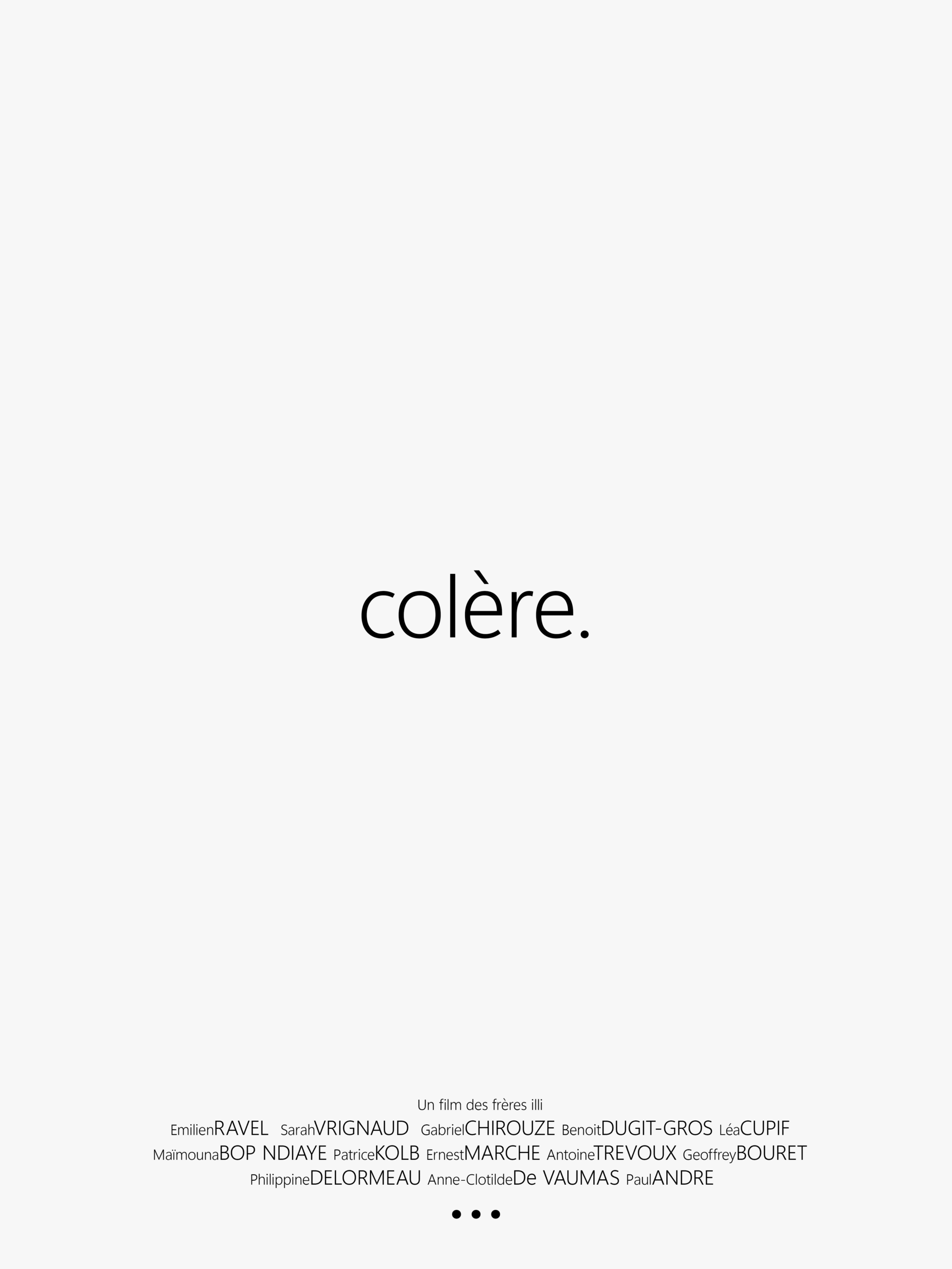 Premier projet expérimental autour du comédien et de ses ressentis personnels, Colère interroge l’acteur sur son jeu. Enfermé seul face à la caméra avec une unique indication : le mot « Colère », l’expérience a pour but de montrer que, sans direction, l’acteur peut aussi trouver des solutions pour créer de l’émotion.